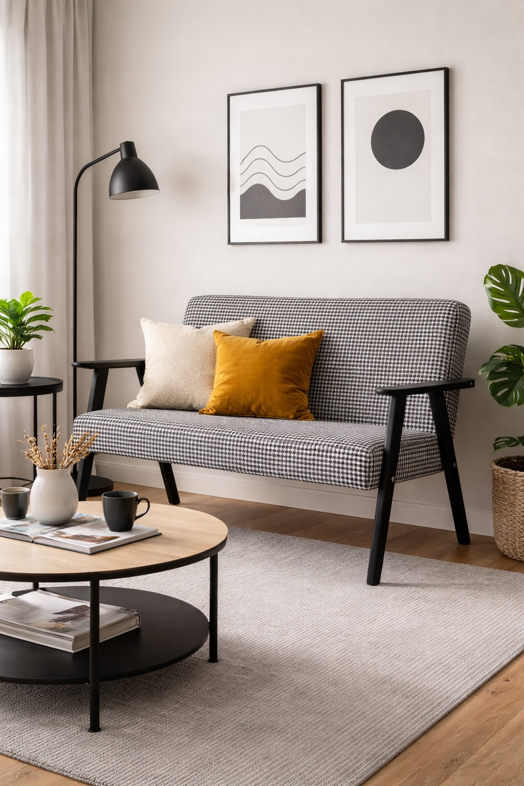 Sofa w stylu PRL retro vintage SOLER Family Meble pepitka czarno biała