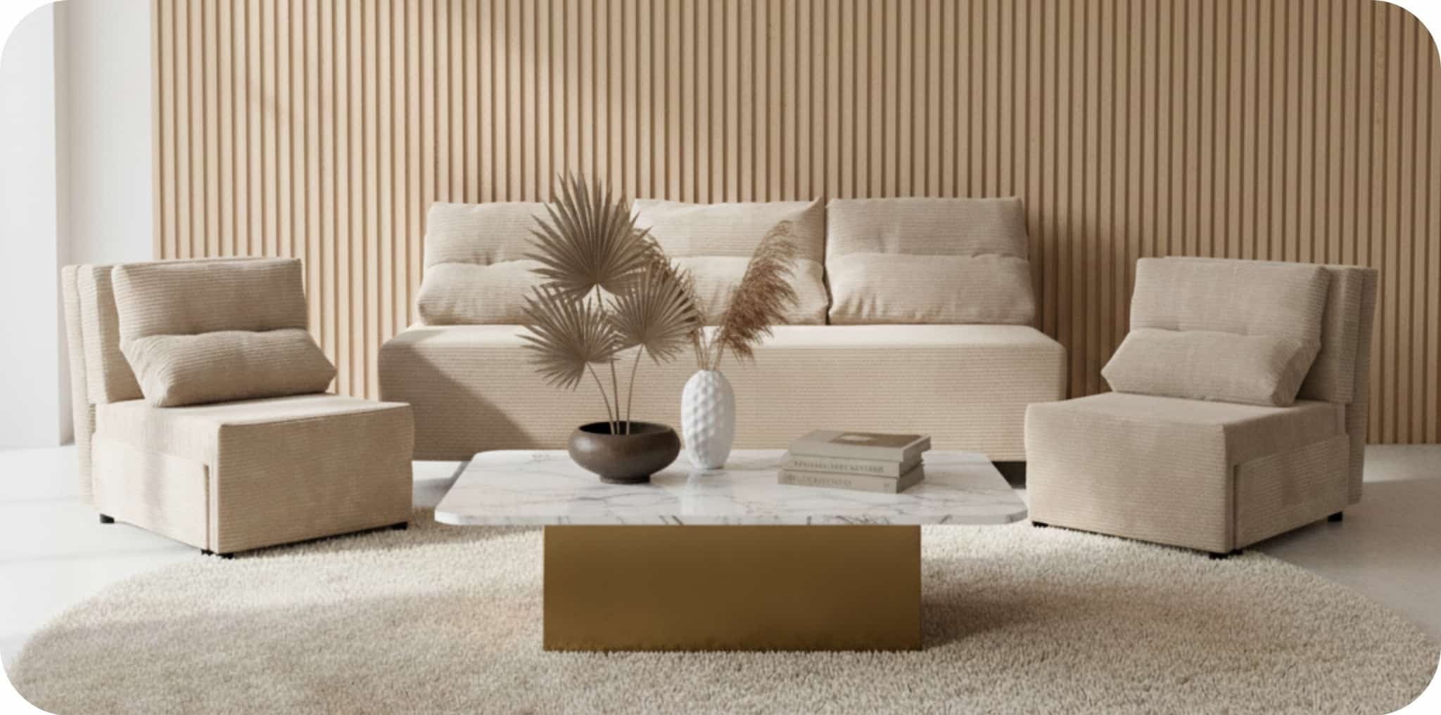 1. Kup zestaw mebli z funkcją spania KIMO – kanapa + 2 fotele