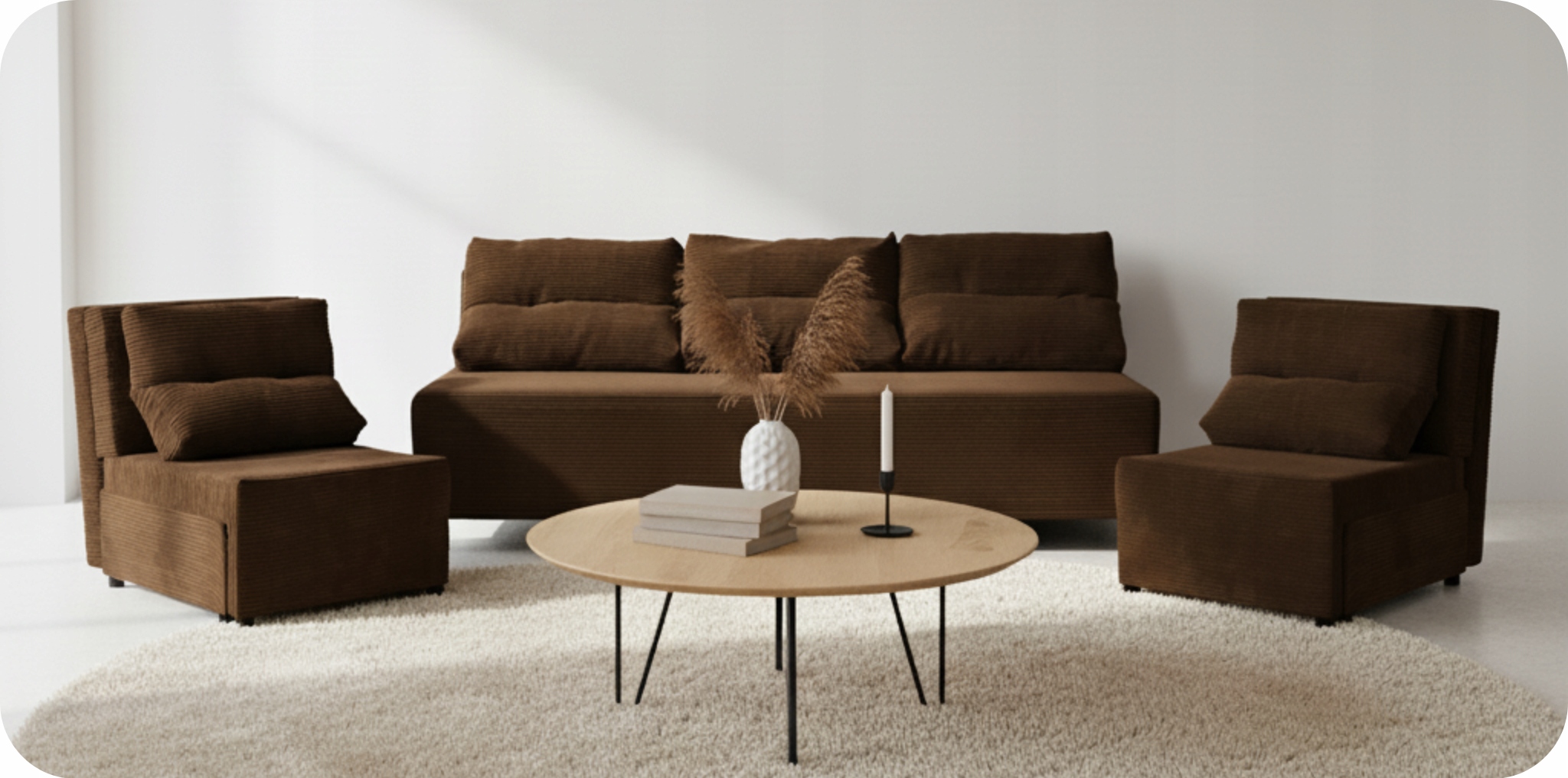 1. Kup zestaw mebli z funkcją spania KIMO – kanapa + 2 fotele