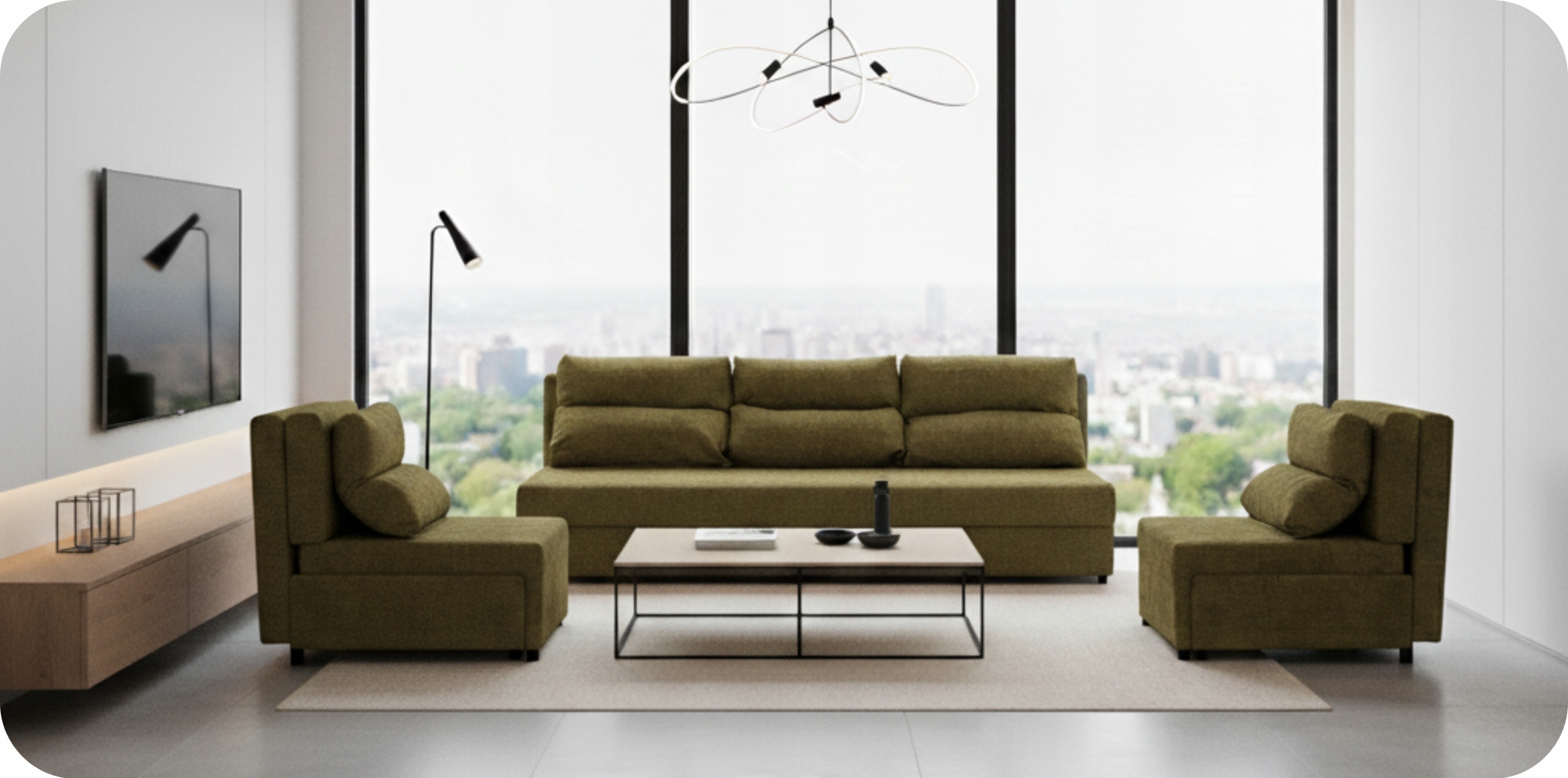1. Kup zestaw mebli z funkcją spania KIMO – kanapa + 2 fotele