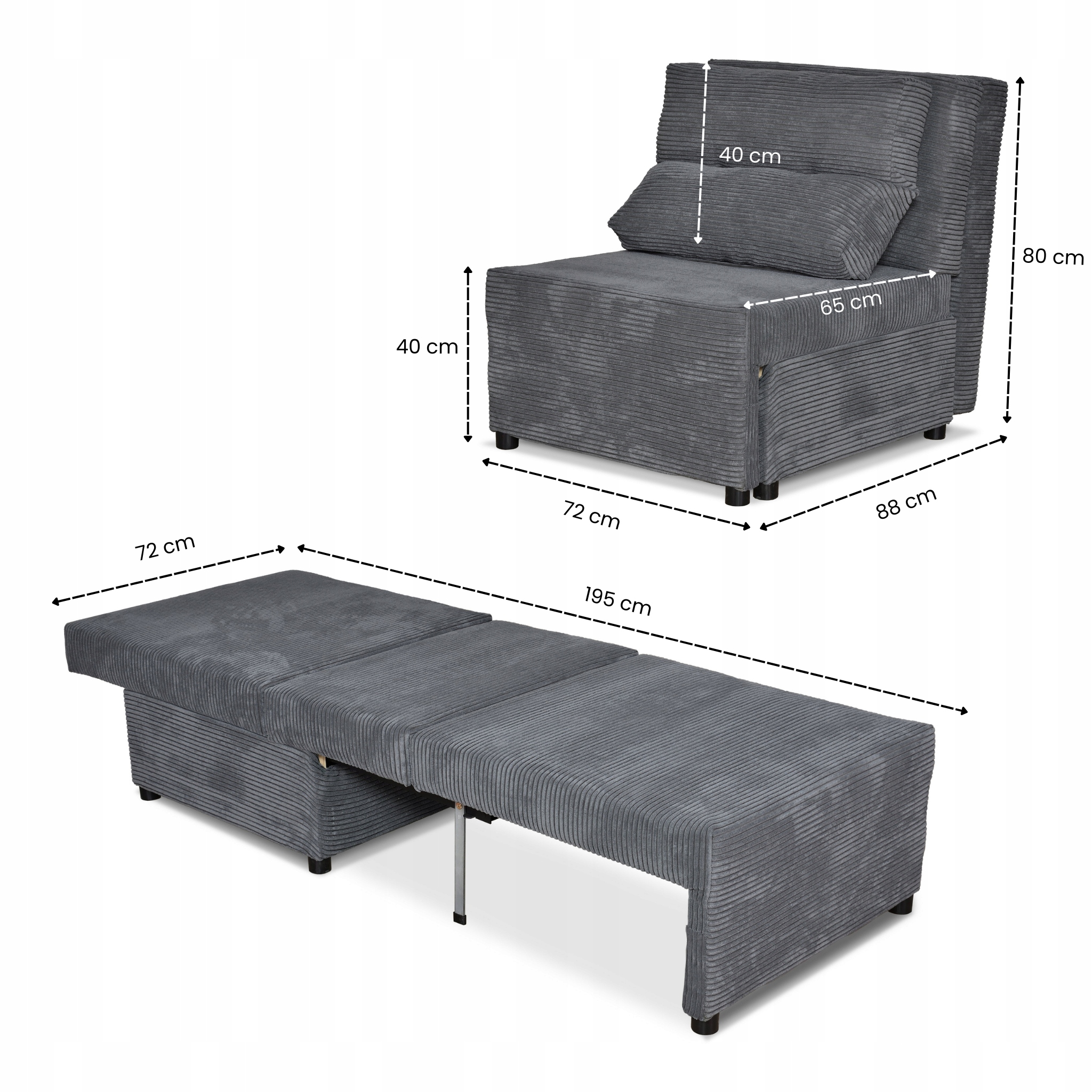 Fotel połączy wygodę siedzenia z funkcjonalnością łóżka. To idealne rozwiązanie do salonu, pokoju młodzieżowego czy pokoju gościnnego. Dzięki solidnej konstrukcji, komfortowej piance HR o grubości 9 cm oraz mechanizmowi rozkładania z pojemnikiem na pościel, sprawdzi się zarówno na co dzień, jak i okazjonalnie jako miejsce do spania.