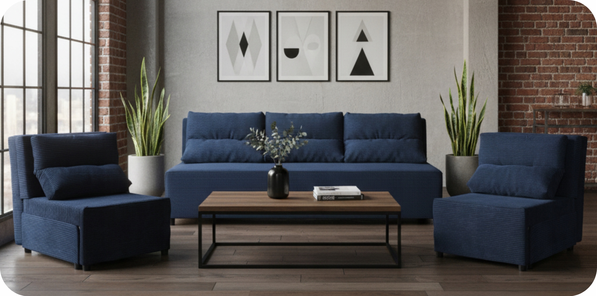 1. Kup zestaw mebli z funkcją spania KIMO – kanapa + 2 fotele