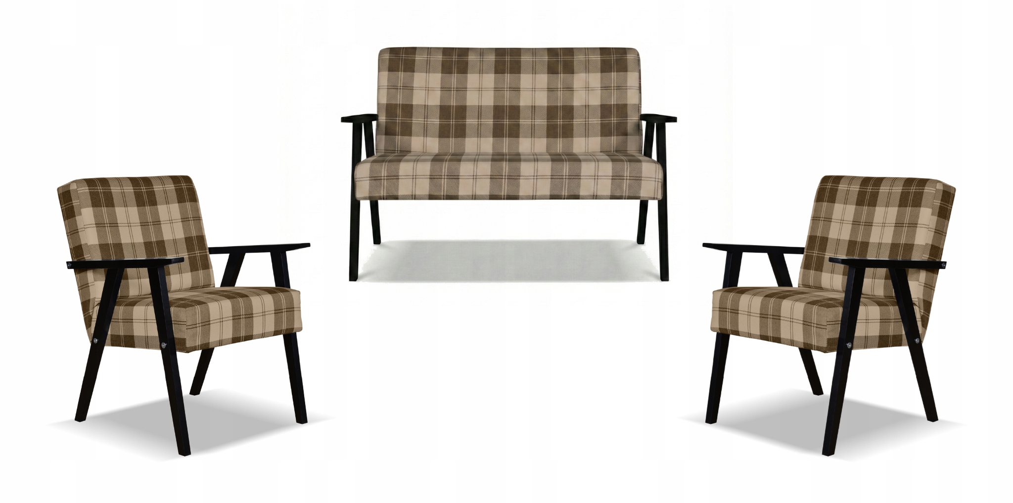 Zestaw mebli PRL retro SOLER sofa fotele Family Meble krata brąz – beż